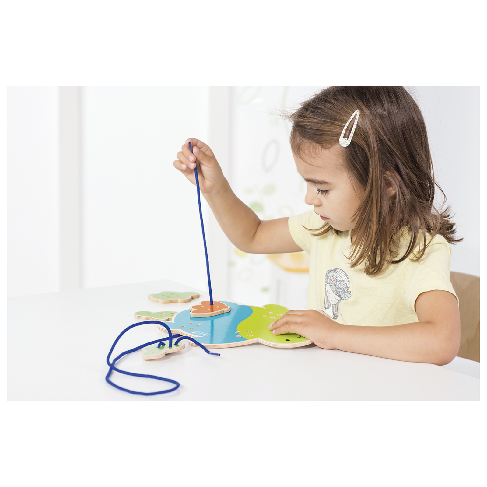 La tortue est livrée avec 4 pièces amovibles et un lacet de couleur. En bois verni. L/l animaux : 22 x 16 cm. L lacet : 120 cm.