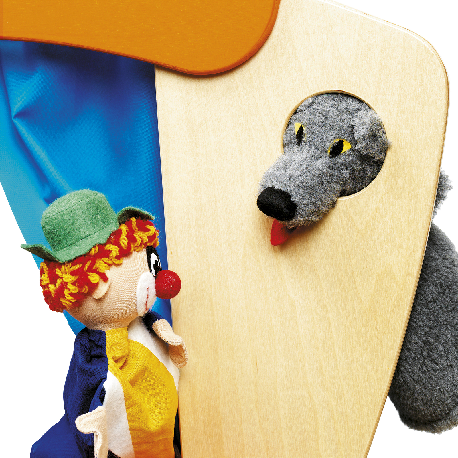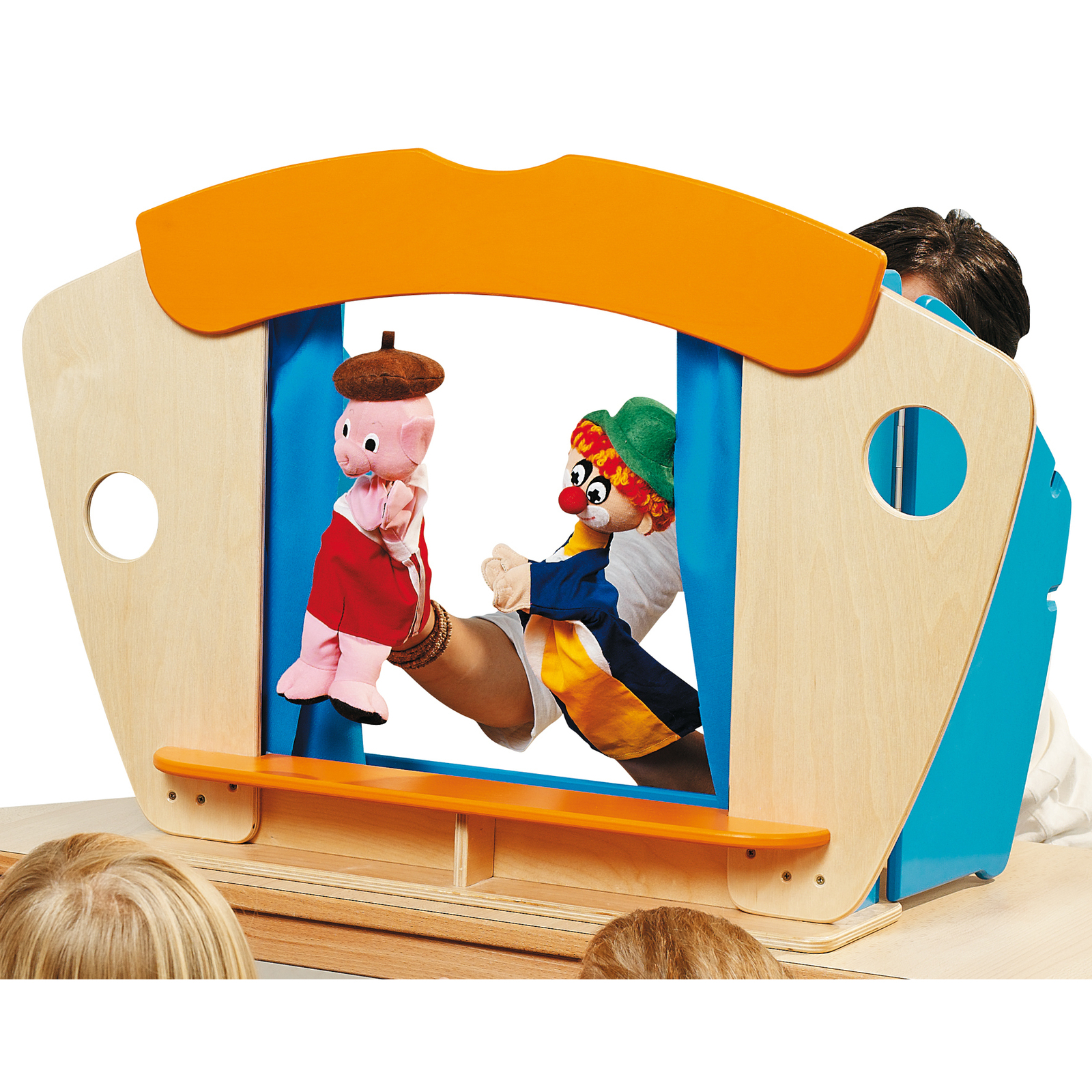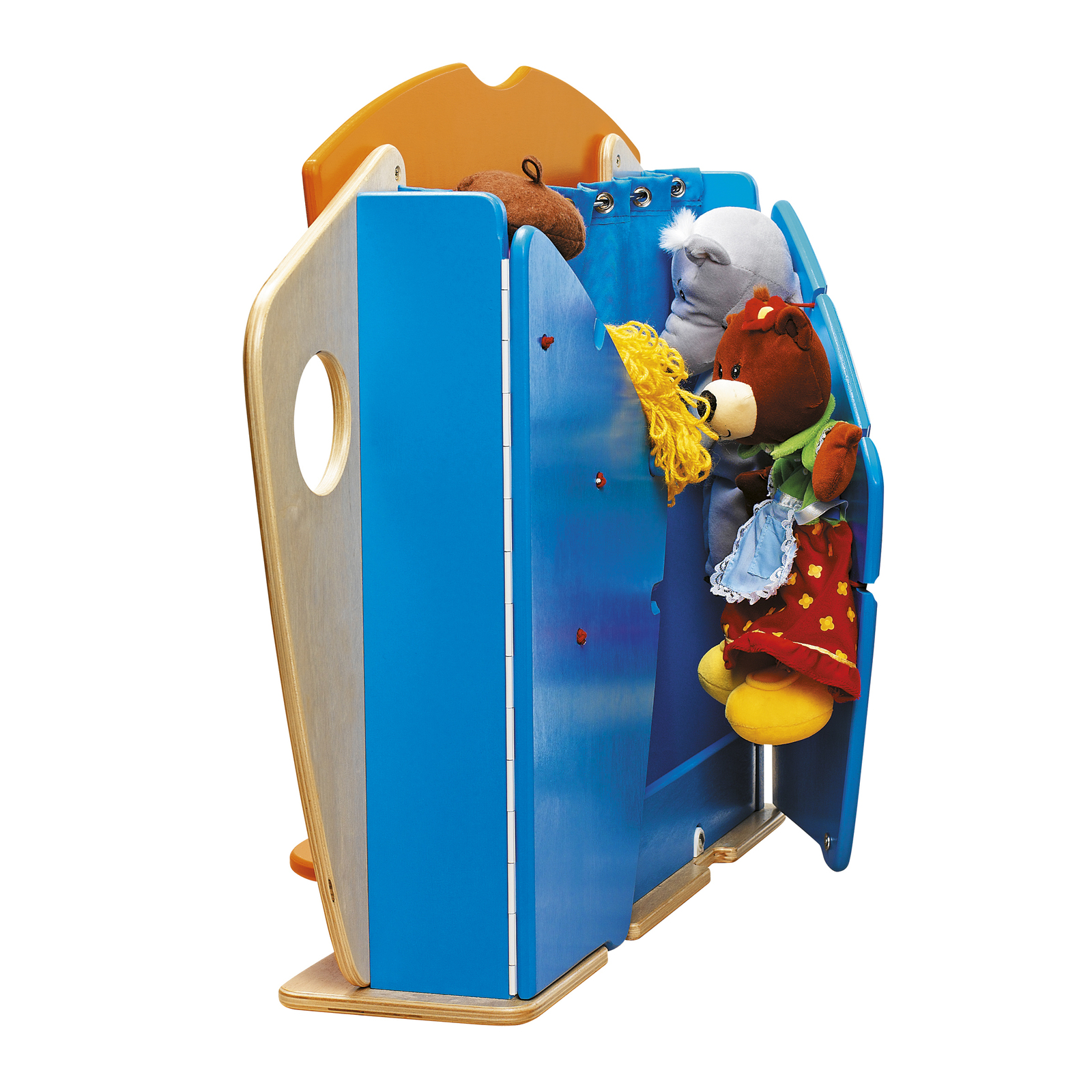 Pour installer en un clin d'œil une activité théâtre, un castelet à placer sur une table ou sur un meuble." "" "Pratique, une fois l'histoire terminée, le rideau et les portes se referment pour ranger jusqu'à 6 marionnettes. En bois contreplaqué, ép.12 et 14 mm, vernis incolore et laqué orange et bleu. Rideaux en tissu imprégné bleu, tringle en métal. L/l/ prof. : 85 x 56 x 18 cm. Livré monté.