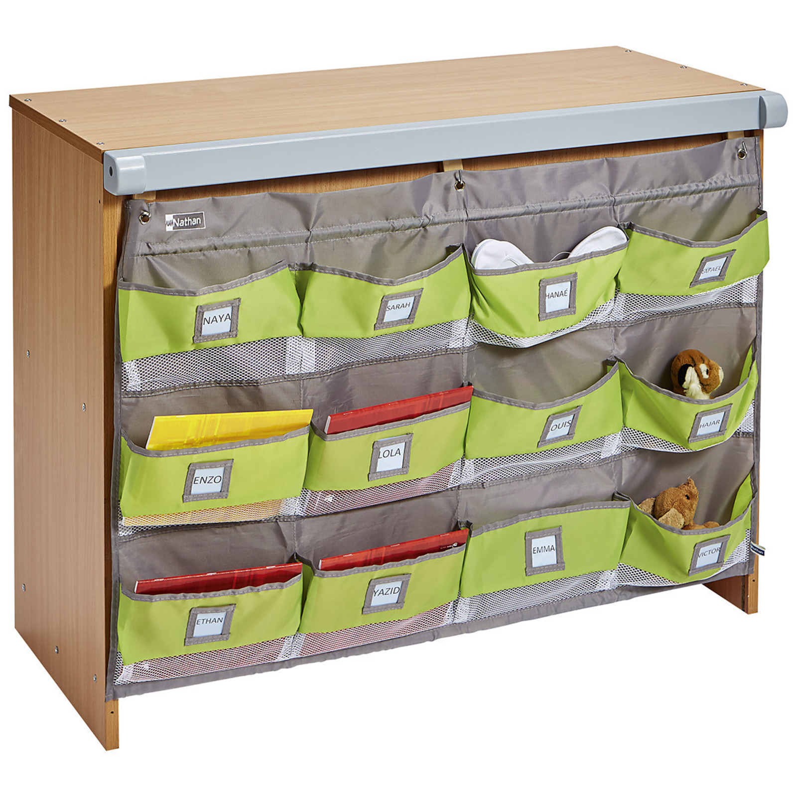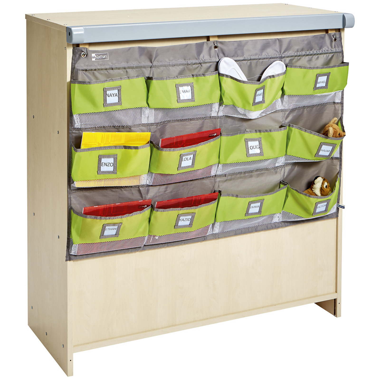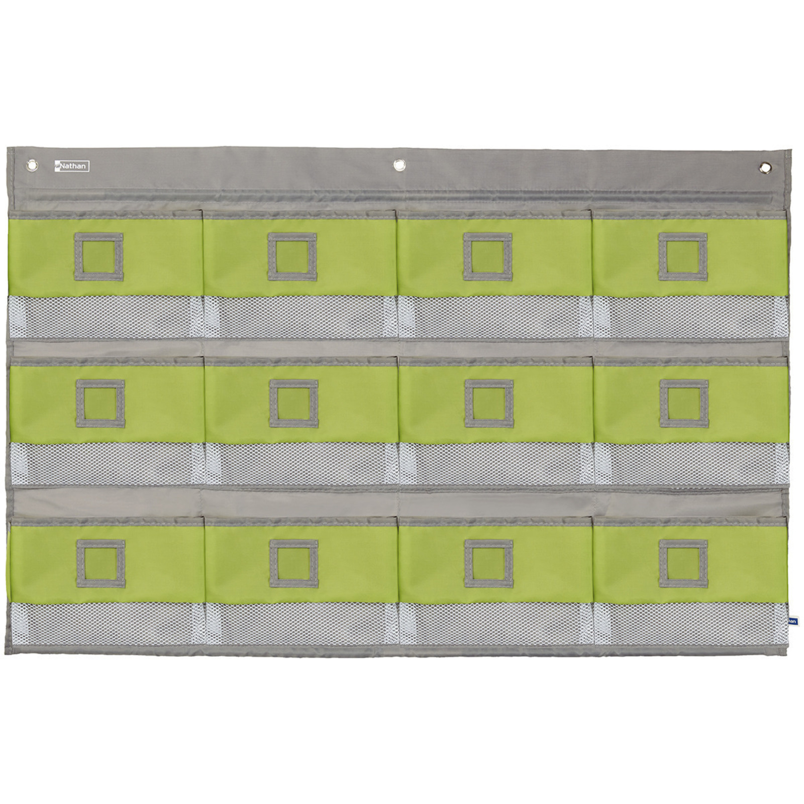 Ces 12 pochettes sont personnalisables avec fenêtre d'identification pour faciliter l’organisation du rangement de doudous, petites affaires des enfants ou petit matériel… " "La partie inférieure (filet) donne une bonne visibilité du contenu de la pochette. " "" "Se fixent très facilement au mur, à la hauteur des enfants. Elles peuvent aussi se fixer au dos d’un meuble MobiNathan à l’aide du dispositif d’accrochage (vendu séparément). 3 œillets pour accrochage. L/H : 100 x 65 cm. L/l/H pochette : 15 x 24 x 4 cm. L/l fenêtre plastique : 6 x 6 cm.