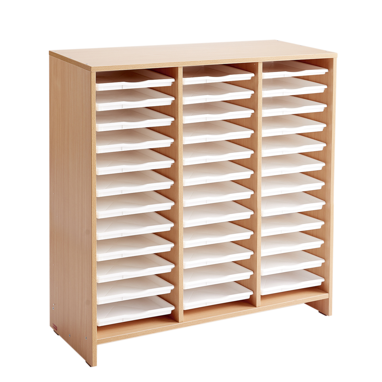 Un meuble teinté hêtre livré avec 36 plateaux blancs amovibles. L/l/H : 100 x 41,5 x 106 cm. L/l/H plateau : 37,6 x 31 x 3 cm.