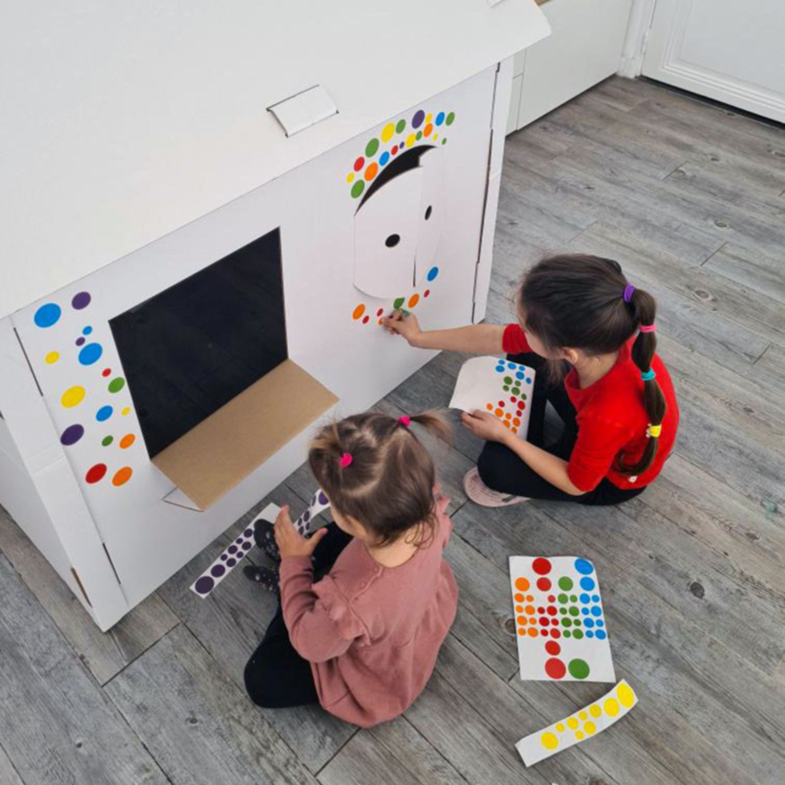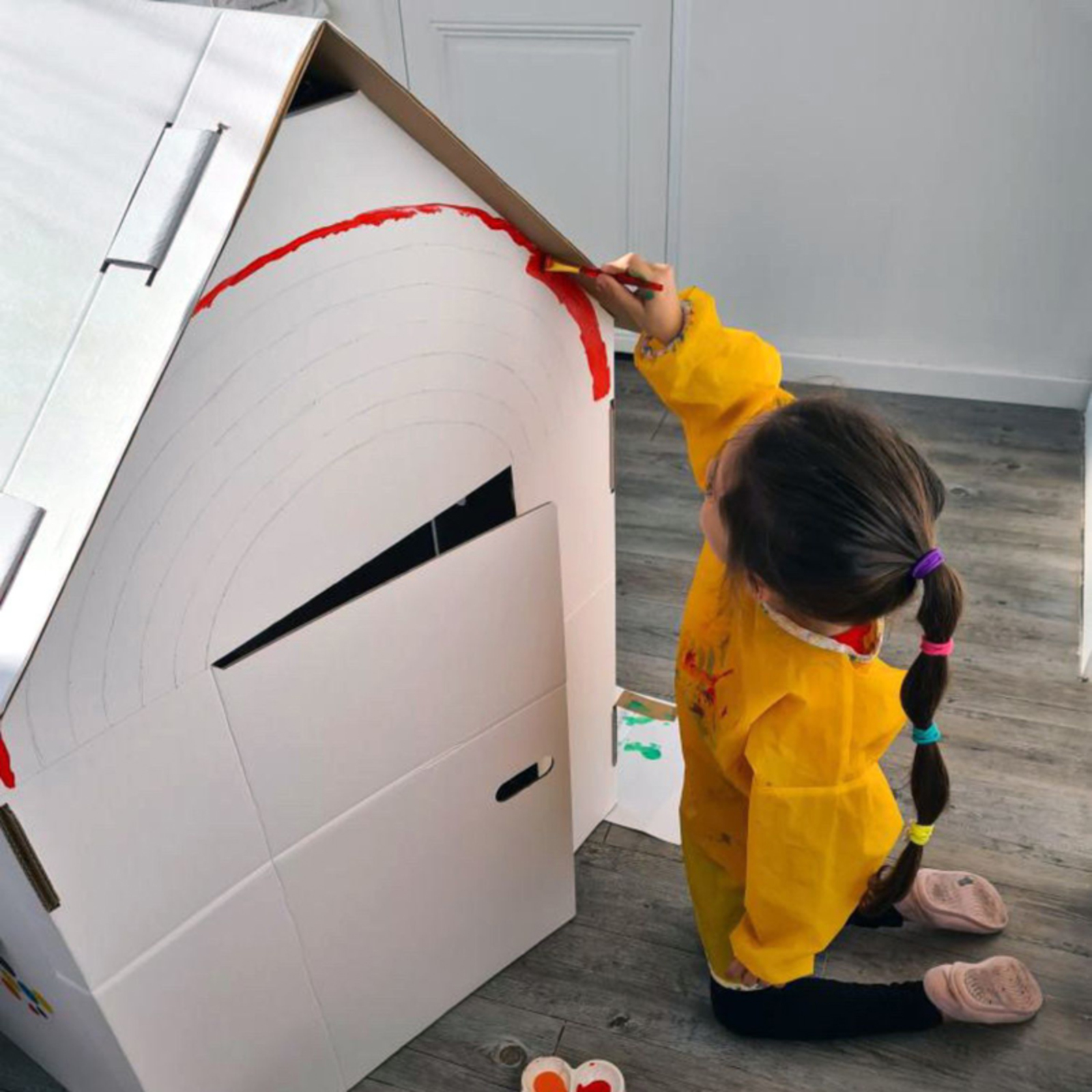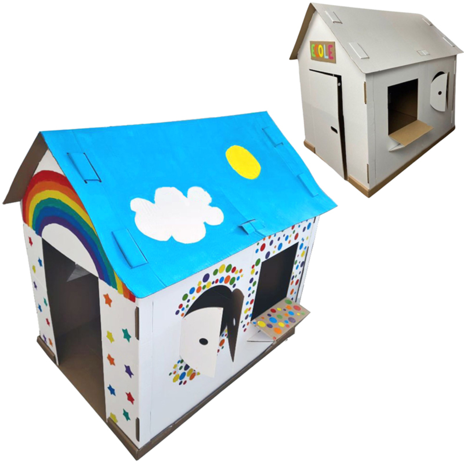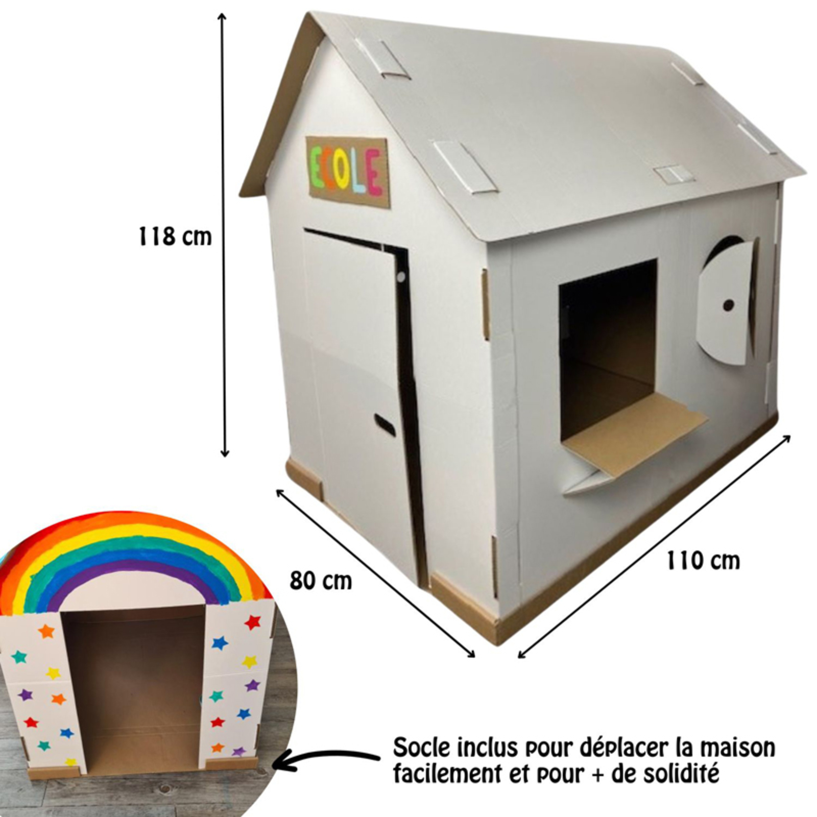 La maison peut être décorée avec de la peinture ou des gommettes. Le socle inclus apporte une plus grande rigidité une fois la maison montée, et permet de la déplacer plus facilement. Facile à monter soi-même. Livré à plat : 6 pièces à assembler. Dim. (L x l x H) : 118 x 110 x 80cm - L'unité